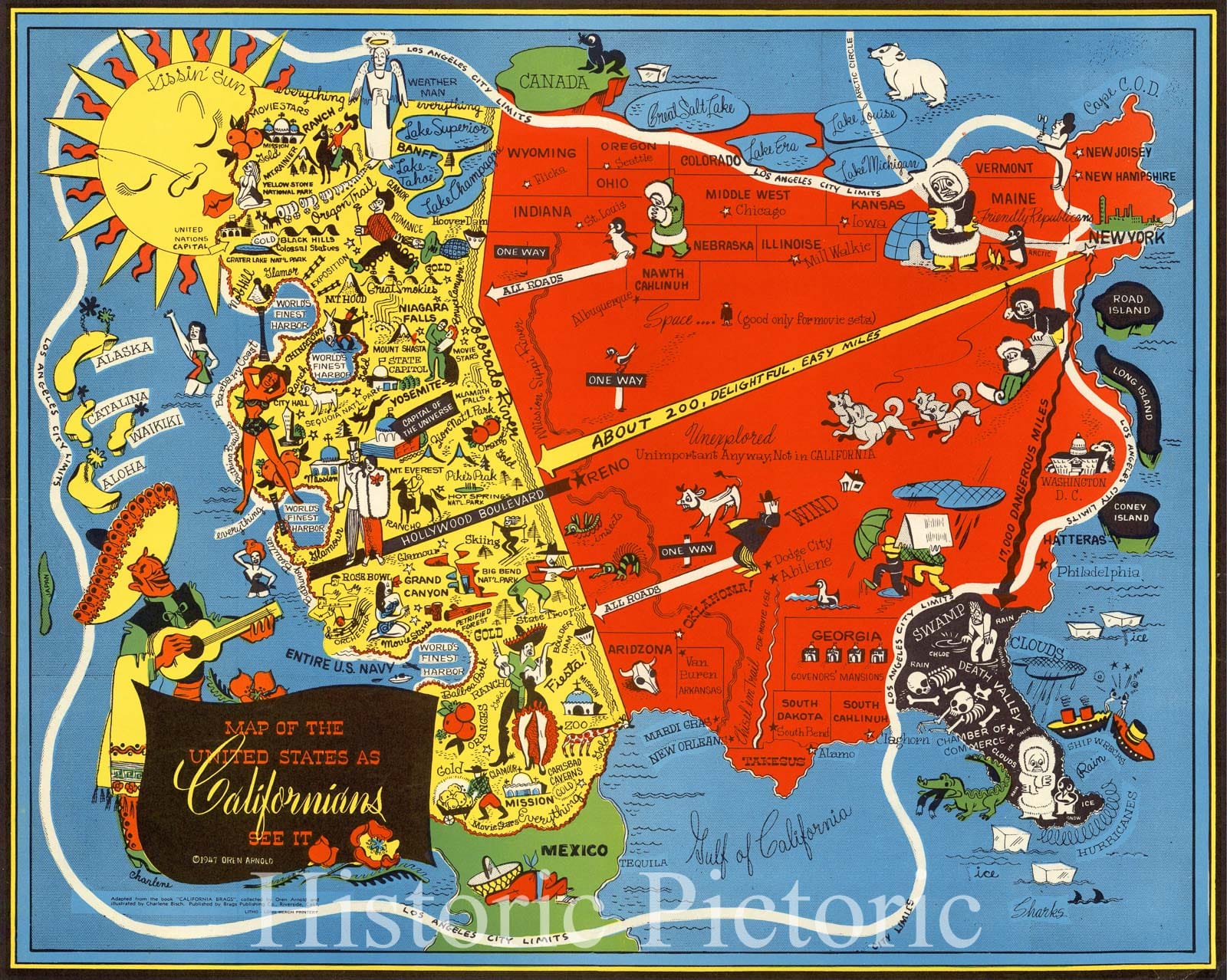 Historic Map - Map of the United States as Californians See It, 1947, Oren Arnold v2