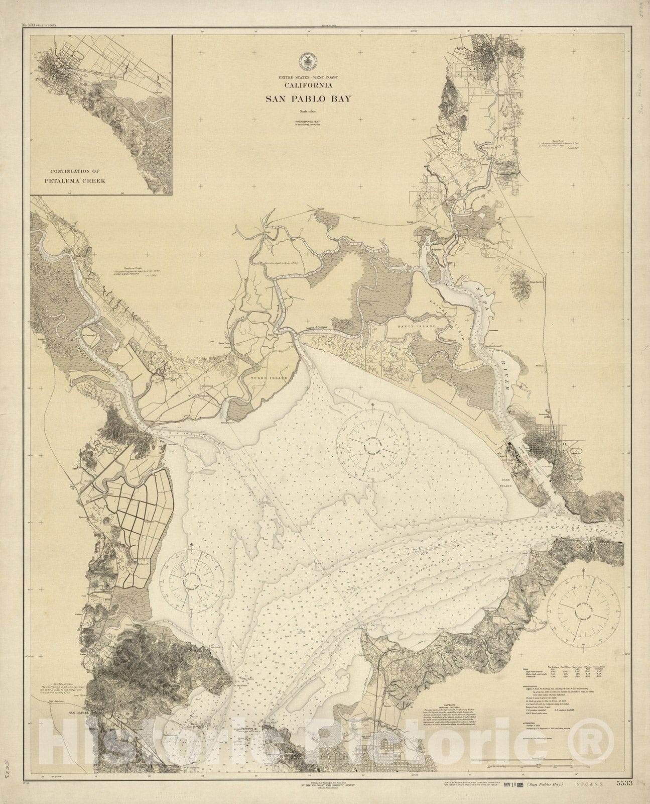 United States--West coast, California, San Pable Bay. Published at Washington, D.C., June 1925. By the U.S. Coast and Geodetic Survey, E. Lester Jones, Director. Surveys ... 1923. Surveys by U.S. Engineers ... to 1925. 25-6/2. (on lower right margin): (San Pablo Bay, ) U.S.C. & G.S. 5533. (inset map) Continuation of Petaluma Creek. | United States--West coast, California, San Pable Bay. Published at Washington, D.C., June 1925. By the U.S. Coast and Geodetic Survey, Lester E. Jones, Director. Surveys ... 1923. Surveys by U.S. Engineers ... to 1925. 25-6/2. (on lower right margin): (San Pablo Bay, ) U.S.C. & G.S. 5533. (inset map) Continuation of Petaluma Creek. |
