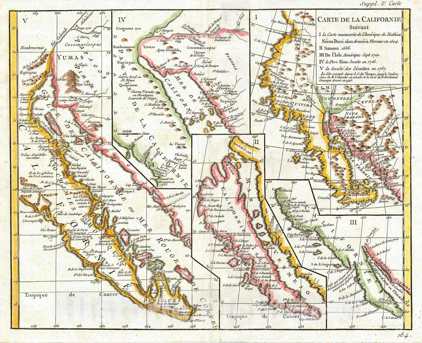 A rare and important map of California in five different states, ranging from roughly 1656 to 1767. Engraved by the important French cartographer Robert De Vaugondy, for the c. 1770 edition of the Denis Diderot (1713-84) Encyclopedie . This map explores the confused state of California cartography in the late 18th century. Examines the gradual discovery of California through various seminal mappings. Initially uses the work of Italian cartographer Matheau Neron Pecci (1604) which correctly presumed that the main body of California extended southward into a peninsula. The next map illustrated, by N. Sanson in 1656, displays in insular California. Map no. III, by Guillaume de L'Isle (1700) reattaches California to the mainland, returning to the early peninsular theory. Next, Vaugondy exhibits part of the seminal Kino Map. This map, rendered by a Jesuit missionary c. 1705 was the work that finally disproved the California Insular theory. Father Franz Kino walked this region between 1698 and 1701. The final map, produced by unnamed Jesuits c. 1767 is a somewhat accurate depiction of the Baja California peninsula. These maps all predate the discoveries of Captain Cook’s voyages and hence Diderot’s work was as much speculative as historical. A fine example of an essential work for all serious California collections. This map is part of the 10 map series prepared by Vaugondy for the Supplement to Diderot’s Encyclopédie , of which this is plate 5. This seminal map series, exploring the mapping of North American and specifically the Northwest Passage was one of the first studies in comparative cartography.
