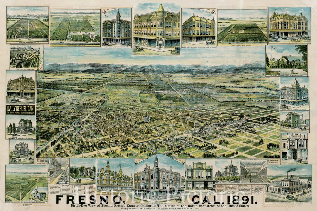 Historic Map : Fresno, Cal. 1891. Bird's-Eye View of Fresno, Fresno County, California. The center of the Raisin industries of the United States., 1891, Vintage Wall Art
