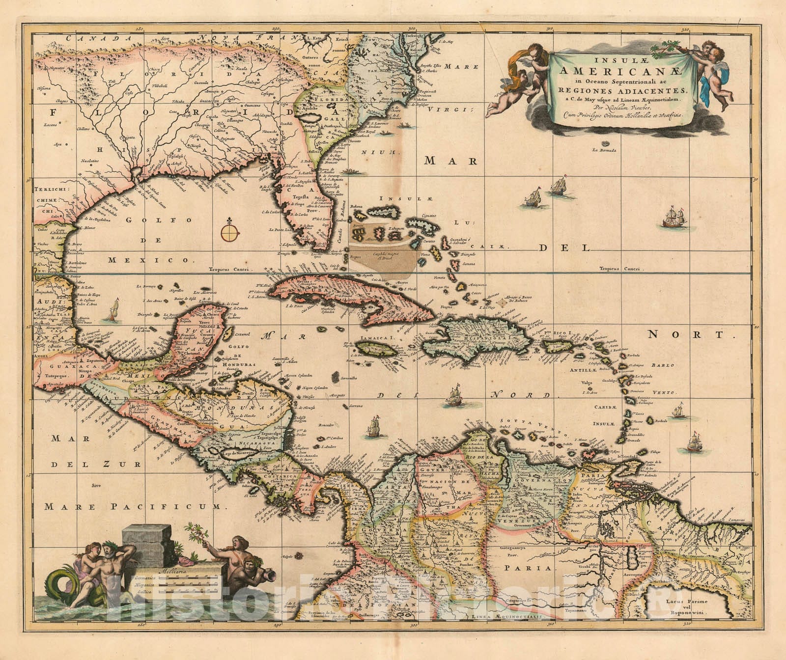 • .Historic Map : The Caribbean, Florida, Central America and Terra Firma, Visscher, 1680, Vintage Wall Art