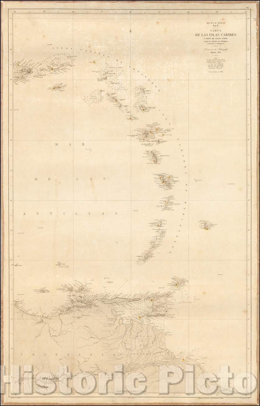 Historic Map - Carta De Las Islas y Parte de Costa Firme segun los trabajos/Sea Chart of eastern Caribbean Ocean and coastline of South America, 1868 - Vintage Wall Art