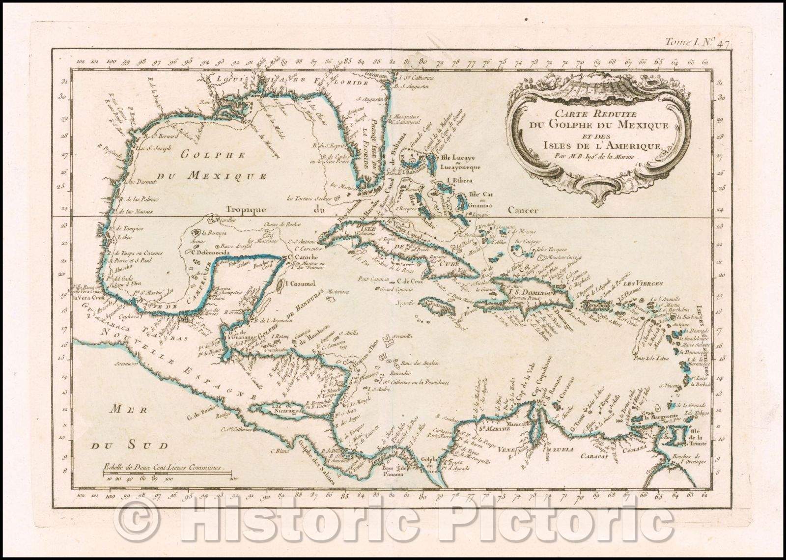 Historic Map - Carte Reduite du Golphe du Mexique et des Isles de l'Amerique :: Caribbean, published in Nicholas Bellin's Petit Atlas Maritime, 1764 - Vintage Wall Art