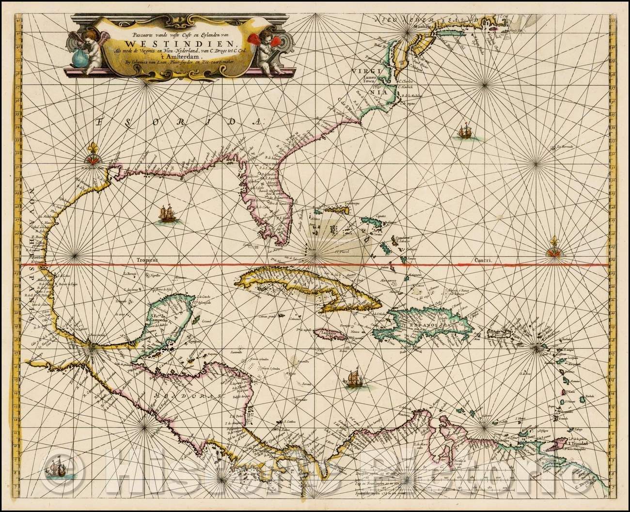 Historic Map - Pascaarte vande vaste kust en Eylanden van Westindien Als mede de Virginis et Nieu-Nederland/Map of the Caribbean by Johannses Van Loon, 1660 - Vintage Wall Art
