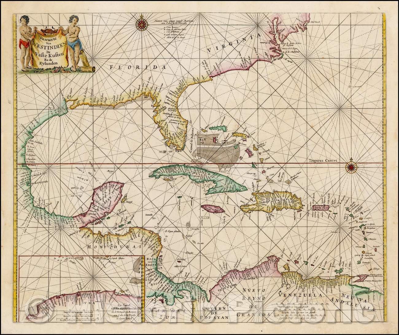 Pascaerte Van Westindien De Vaste Kusten En de Eylanden :: Chart of the Caribbean, Florida, Gulf Coast and Southeastern part of North America, 1666