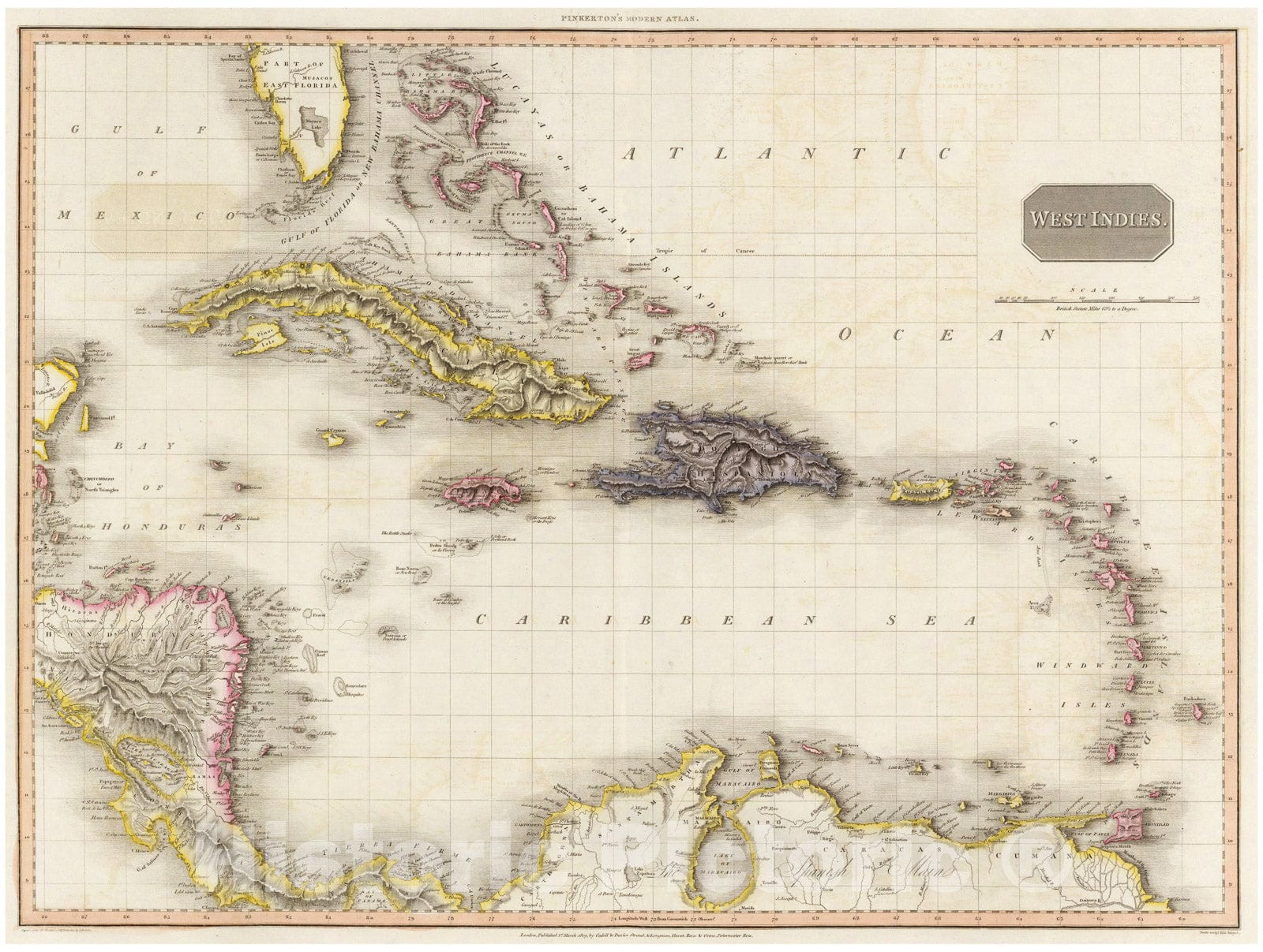 Extraordinary large format map of the West Indies published in 1818 by cartographer John Pinkerton. Centered on the island of Hispaniola or Santo Domingo, this map covers from the Bay of Honduras to the Windward Isles, and from Florida and the Bahamas