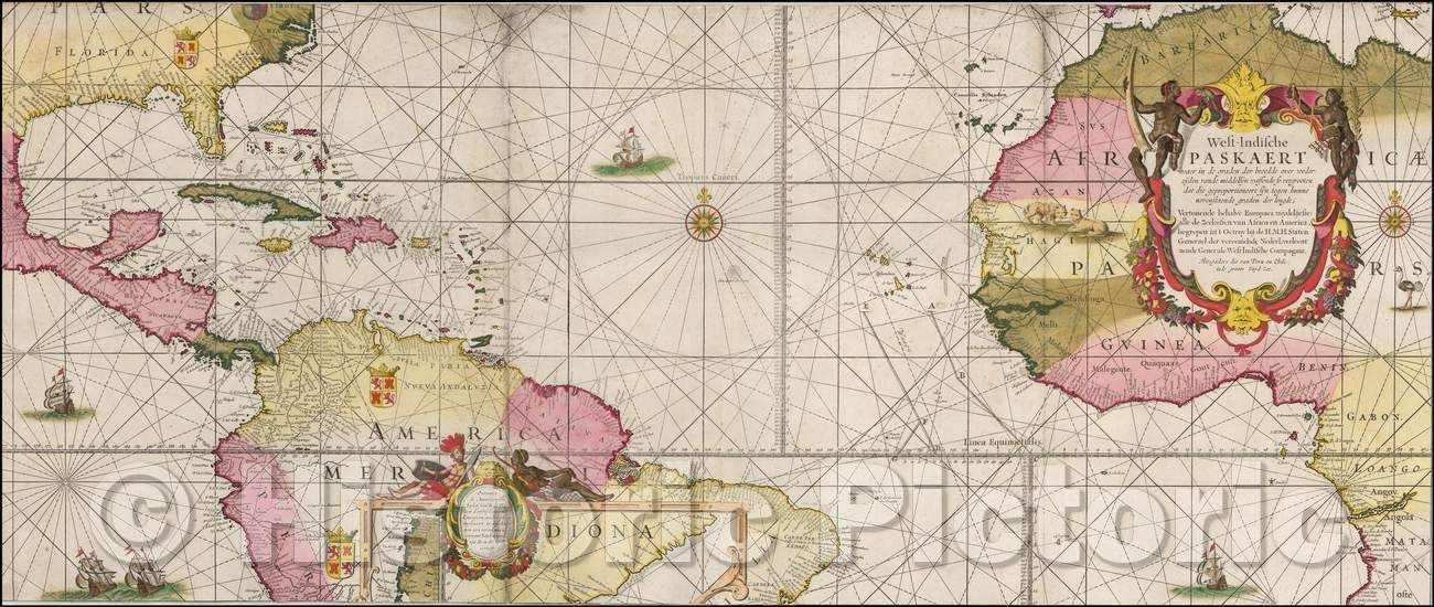 Historic Map - West-Indische Paskaert waer in de graden der breedde over weder zyden vande/West Africa, Caribbean, Central, South America, 1680 - Vintage Wall Art