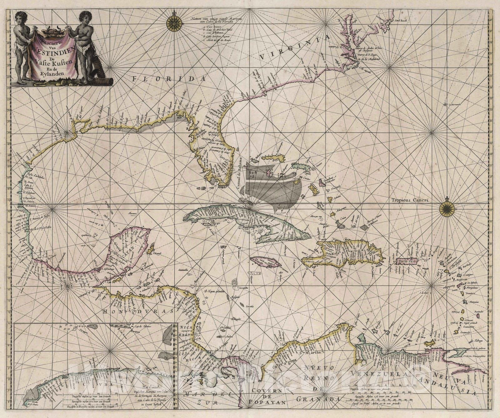 Historic Wall Map : Caribbean, West Indies 1667 Pascaerte van Westindien de Vuste Kusten En de Eylanden. , Vintage Wall Art