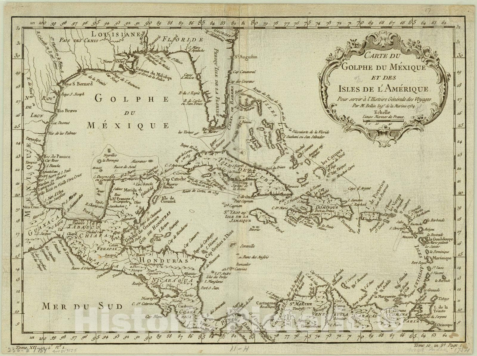 Map : Caribbean 1754, Carte du Golphe du Mexique et des isles de l'Amerique. pour servir a l'Histoire generale des voyages , Antique Vintage Reproduction