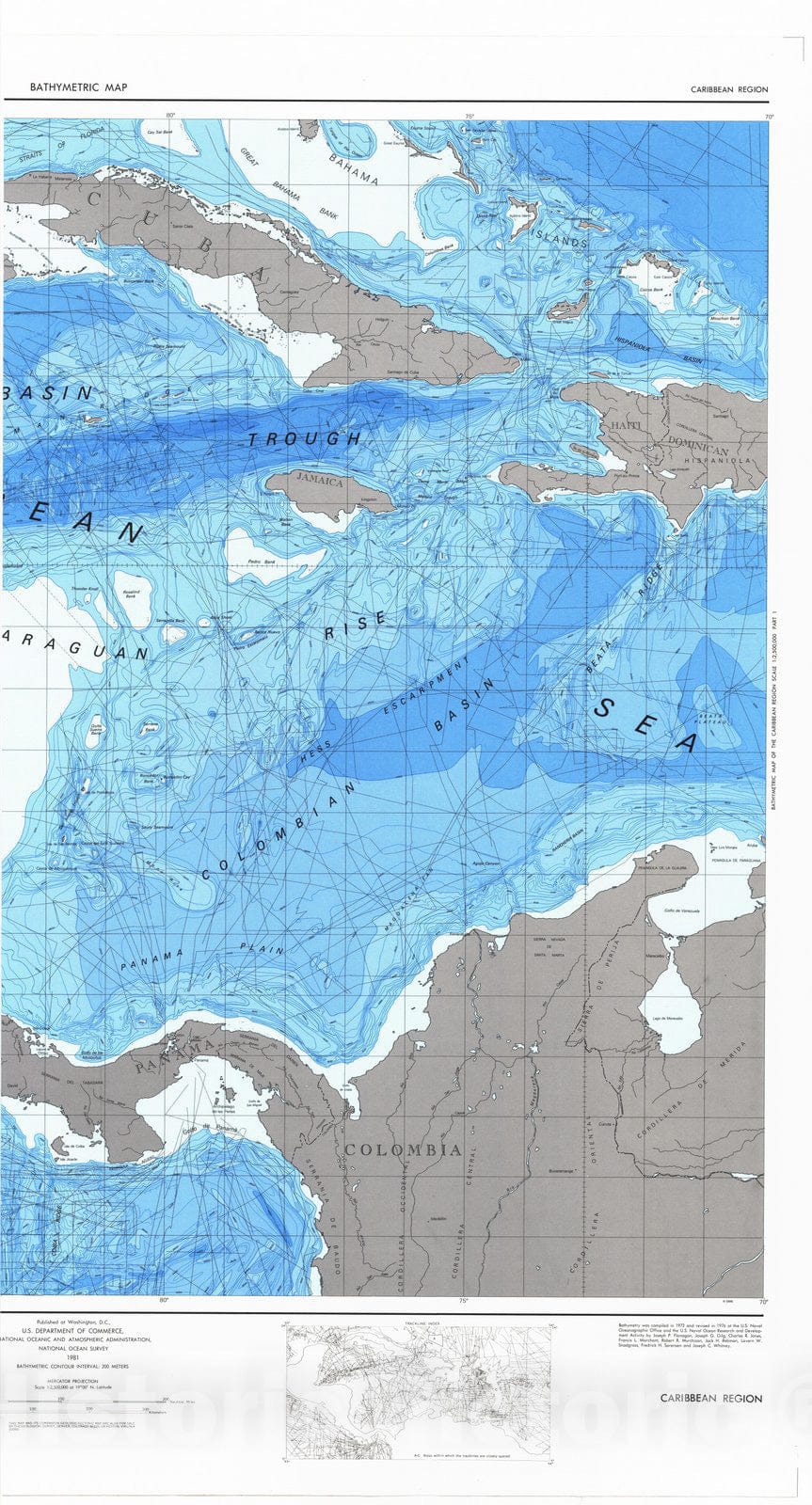 Historic Nautical Map - Caribbean Region, PC, 1981 NOAA Bathymetric Historic Nautical Map - Vintage Wall Art