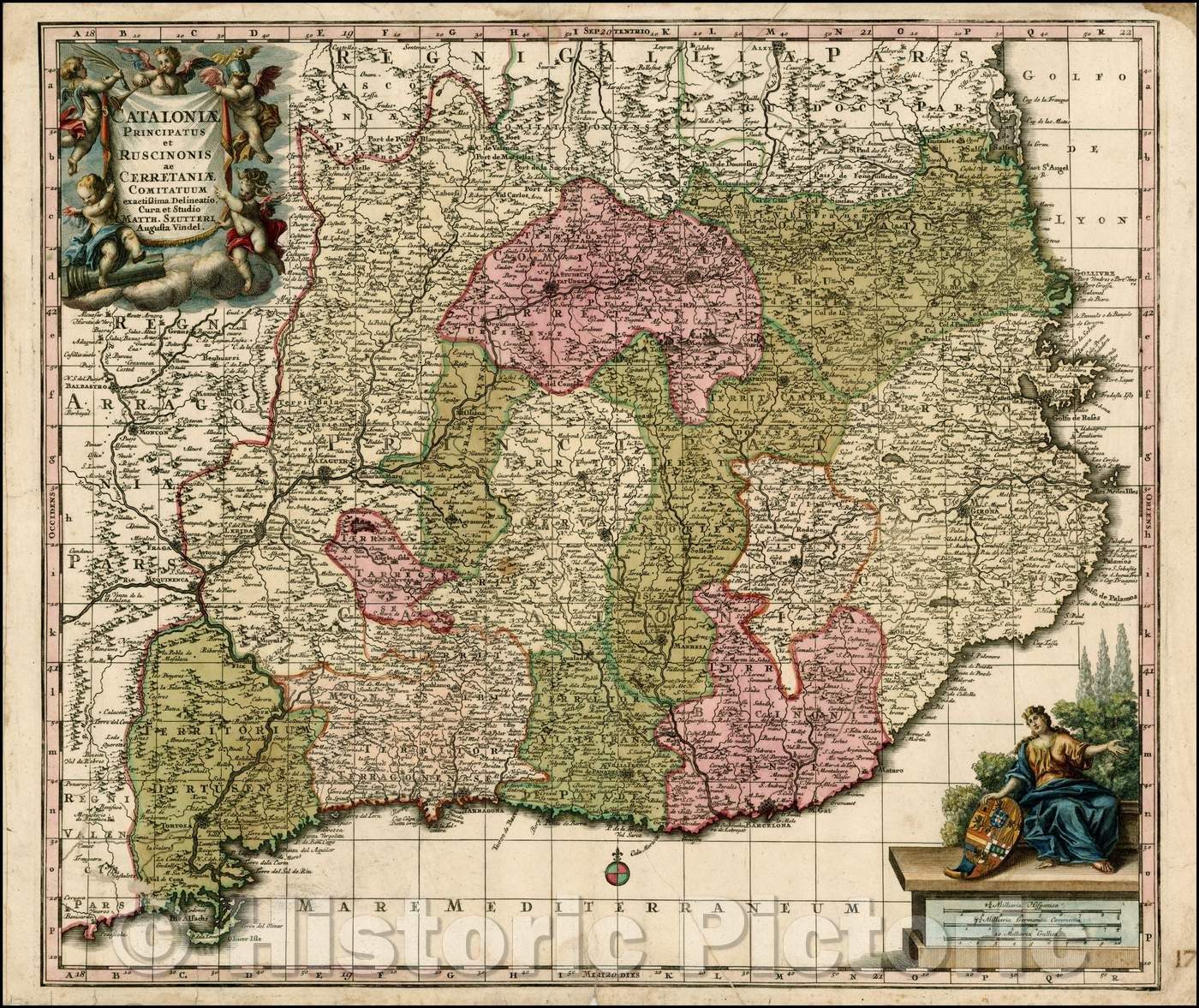 Historic Map - Cataloniae Principatus et Ruscinonis ac Cerretaniae Comitatuum exactissima/Suetter's Map of Catalunya, 1730, Matthaus Seutter - Vintage Wall Art