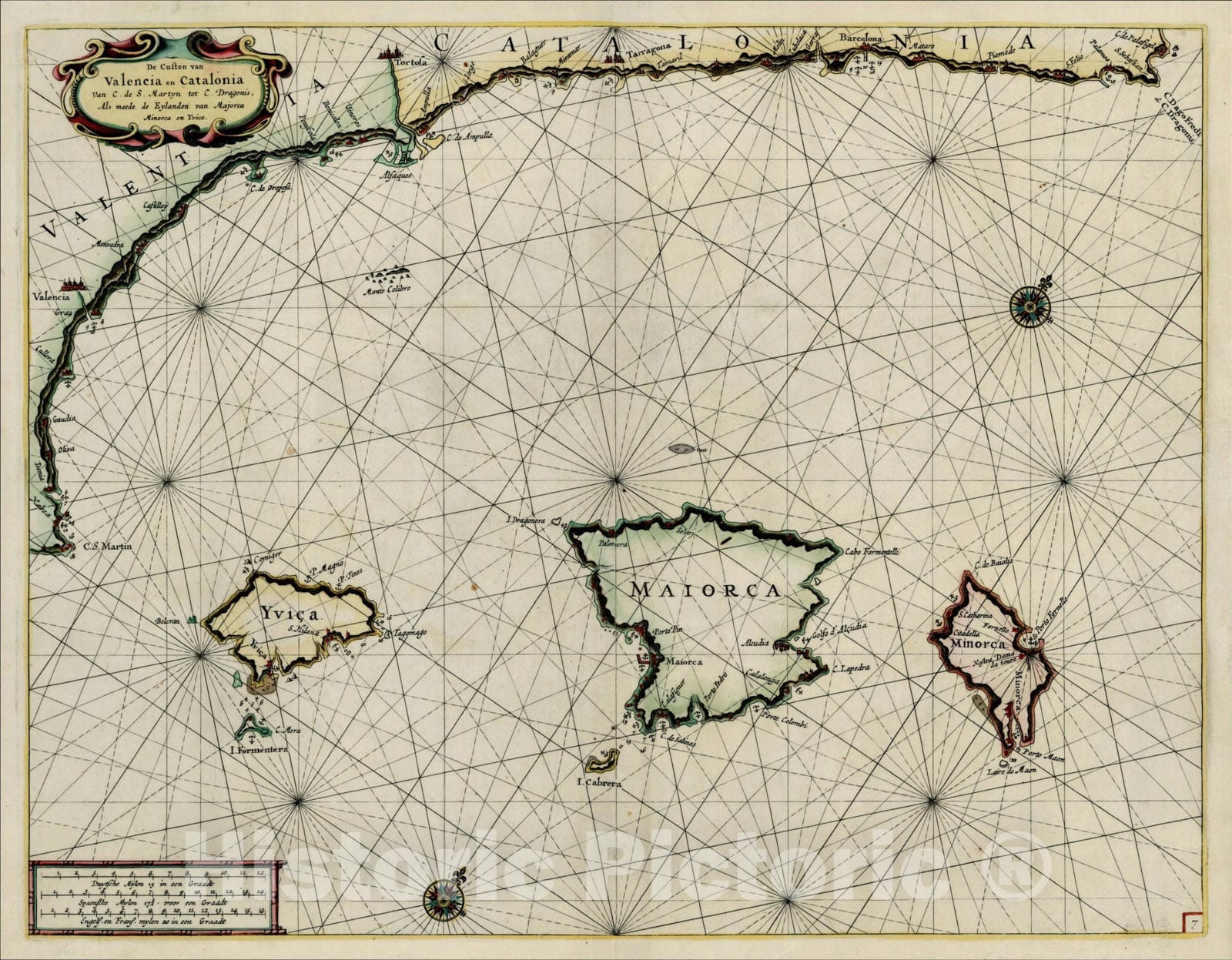 Historic Map : De Custen van Valencia en Catalonia Van C. de S. Martyn tot C. Dragonis, Als meede de Eylanden van Majorca Minora en Yvica, 1662, Pieter Goos, Vintage Wall Art