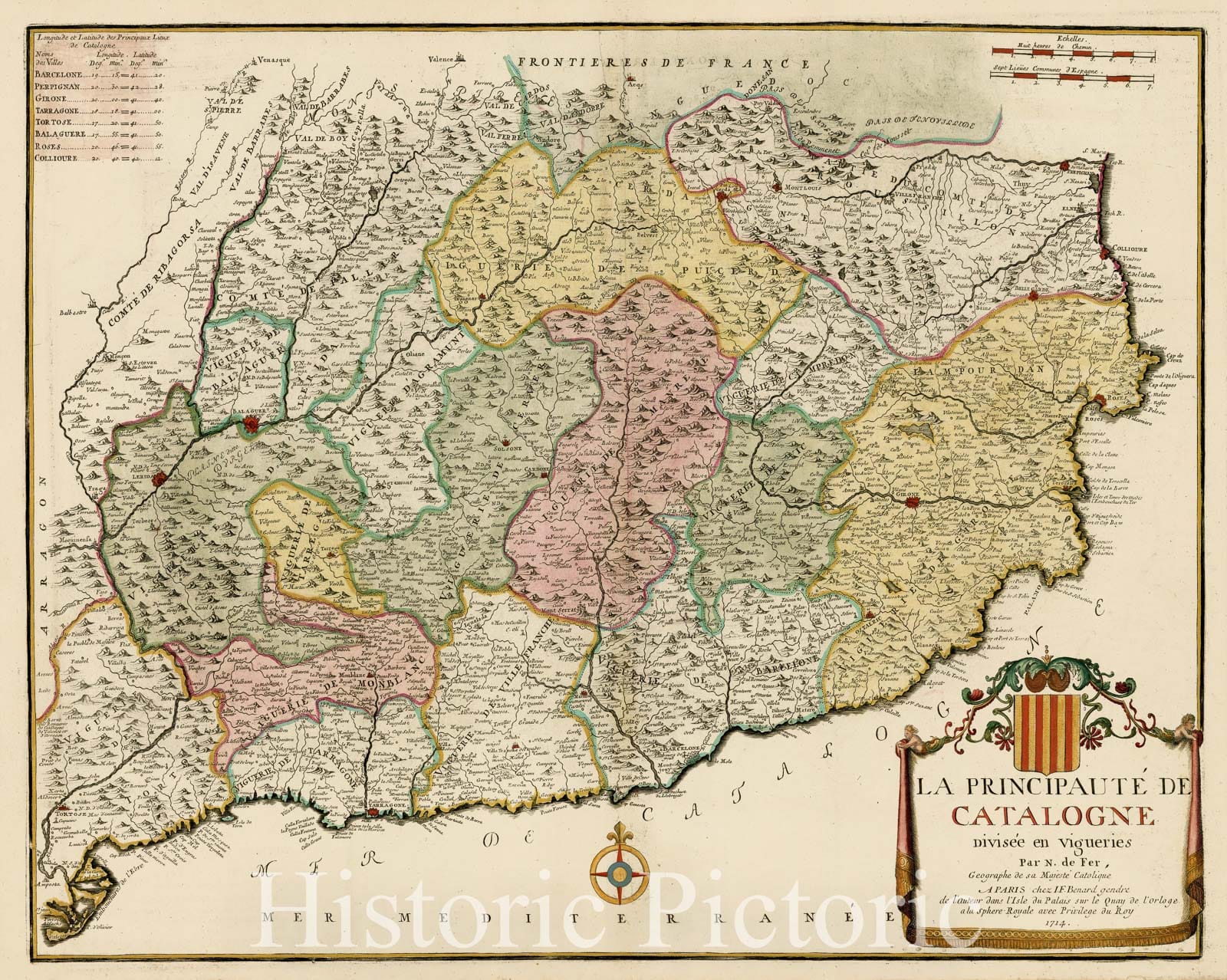 Historic Map - La Principaute De Catalogne Divisee en Vigueries/Map of Catalonia, by Nicolas De Fer, 1714, Nicolas de Fer - Vintage Wall Art