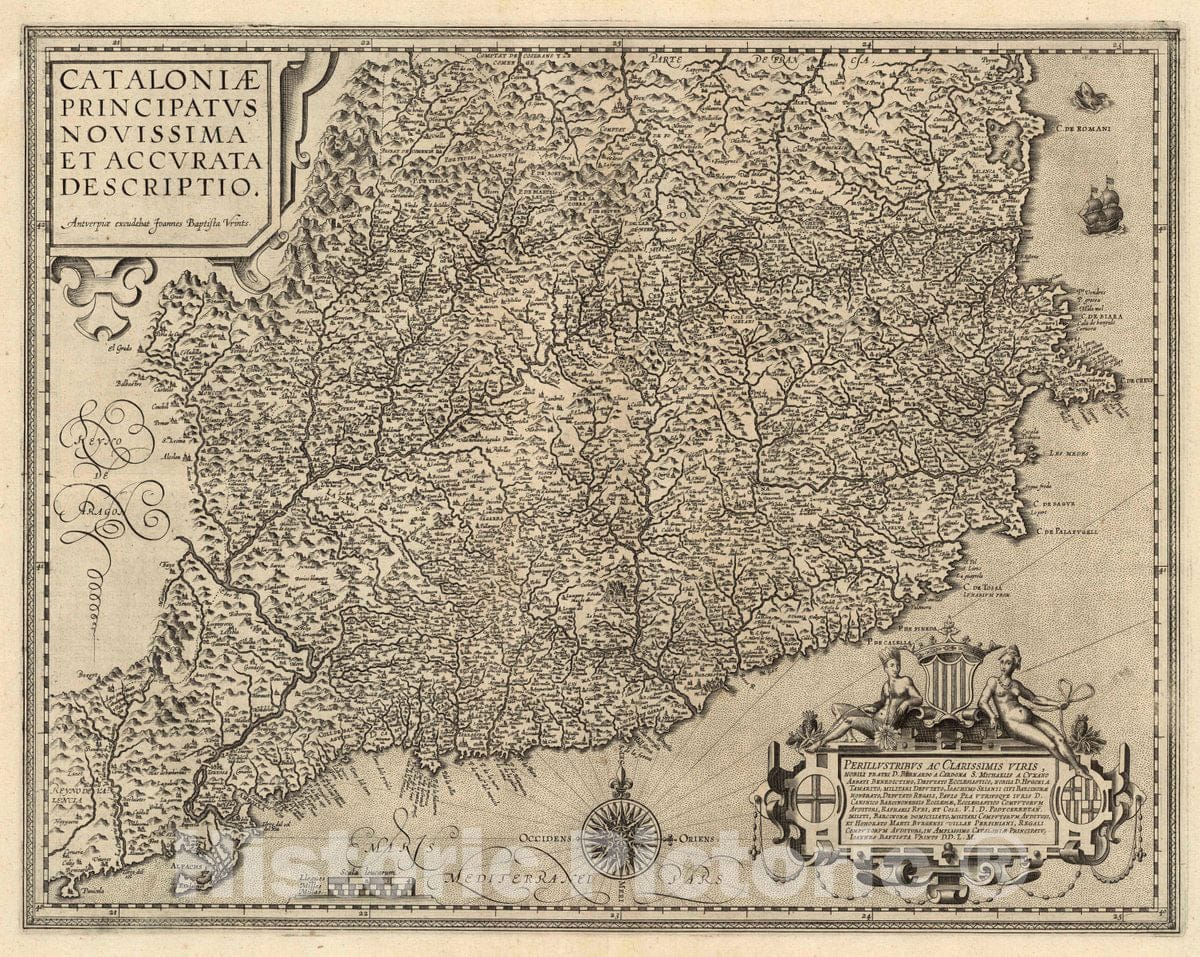 Historic Map : Spain, Catalonia, Spain Cataloniae Principatus Novissima Et Accurata Descriptio. Antverpiae excudebat Joannes Baptista Vrints, 1608 Atlas , Vintage Wall Art