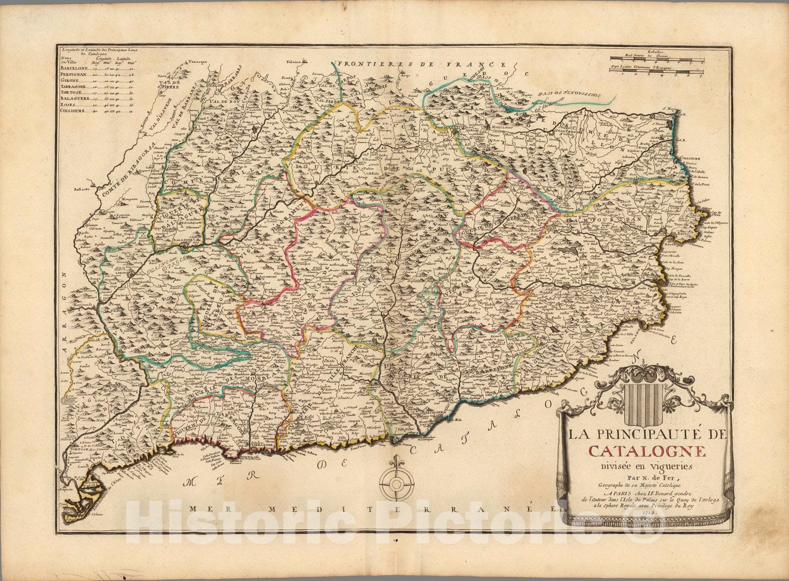 Historic Map : Spain, Catalonia, SpainLe Principaute de Catalogne : divisee en vigueries 1714 , Vintage Wall Art