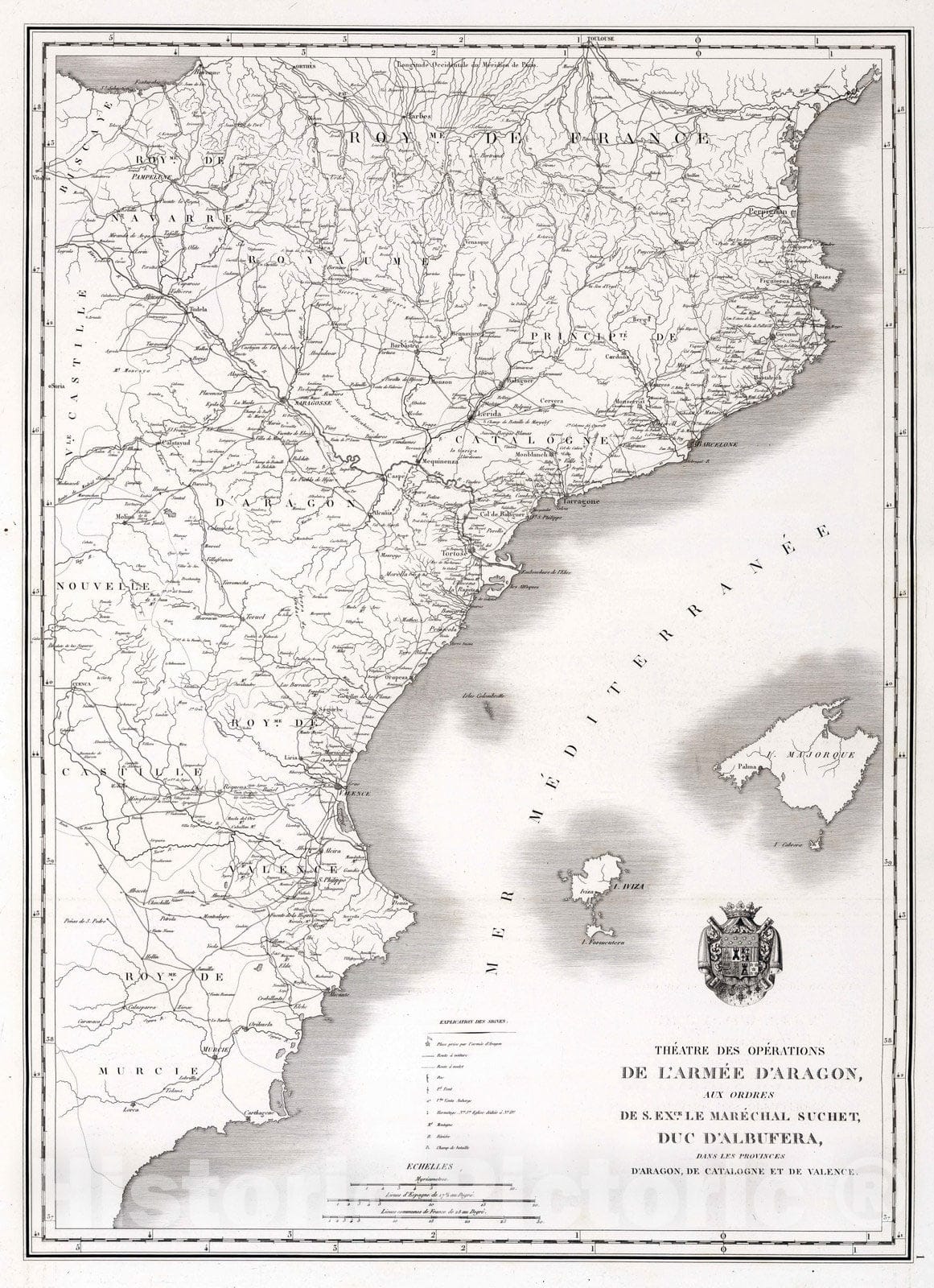 Historic Wall Map : Catalonia , Spain 1828 Theatre des Operations de l'Armee d'Aragon, les Provinces d'Aragon, de Catalogne et de Valence. , Vintage Wall Art