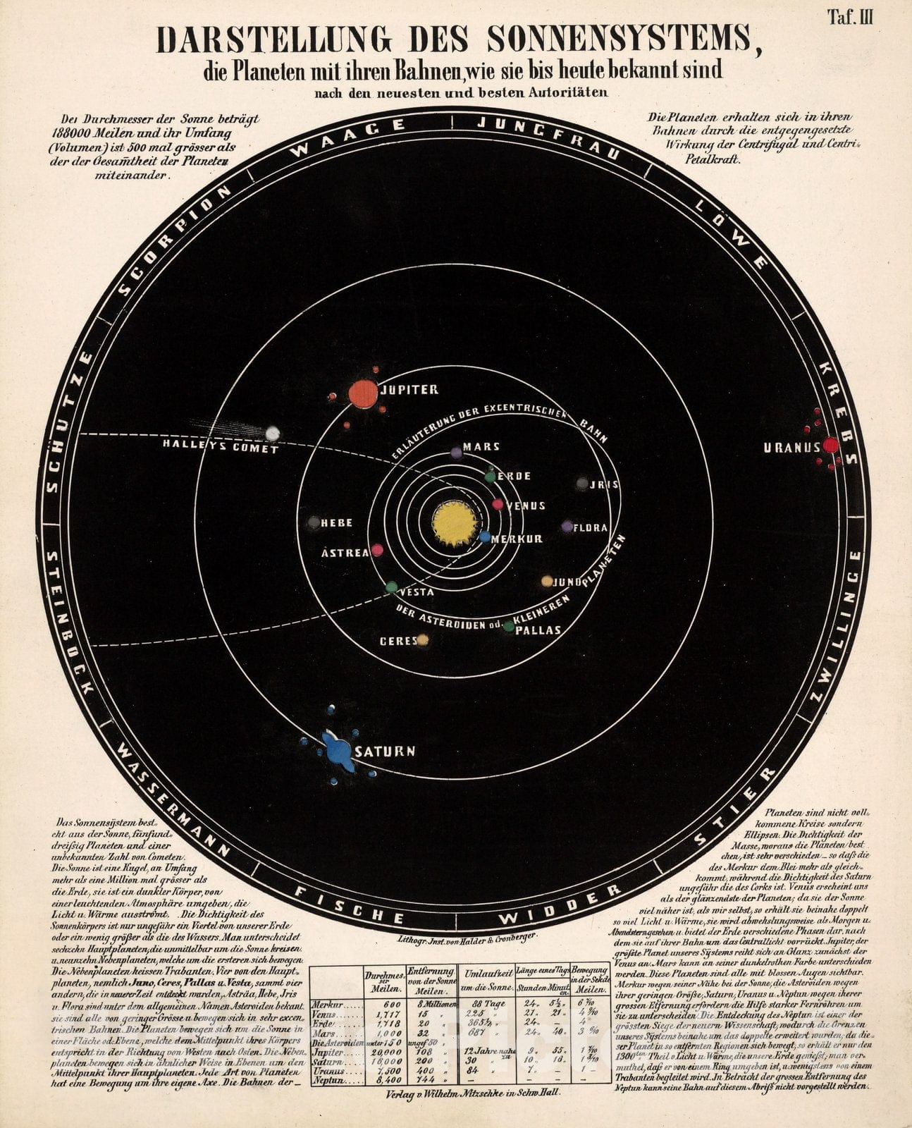 Taf. III. Darstellung des Sonnensystems, die Planeten mit ihren Bahnen, wie sie bis heute bekannt sind. (Representation of the solar system, the planets and their orbits, as they are known today.) | Astronomischen Bilderatlas von Ludwig Prentzinger … Schwaeb. Hall. Druck und Berlag von Wilhelm Nitzschke. (Astronomical Images Atlas of Ludwig Prentzinger ... Schw�b. Hall. Printed and Published by William Nitzschke). | Date estimated. Five of the 12 plates are perforated and backed with translucent colored paper to allow planets, moon, etc. to be illuminated from behind. We show the plain image followed by the illuminated image for Plates 1, 2, 3, 4, and 6. One of several editions - also in French 1862, Swedish 1862, English 1851, German 1851.
