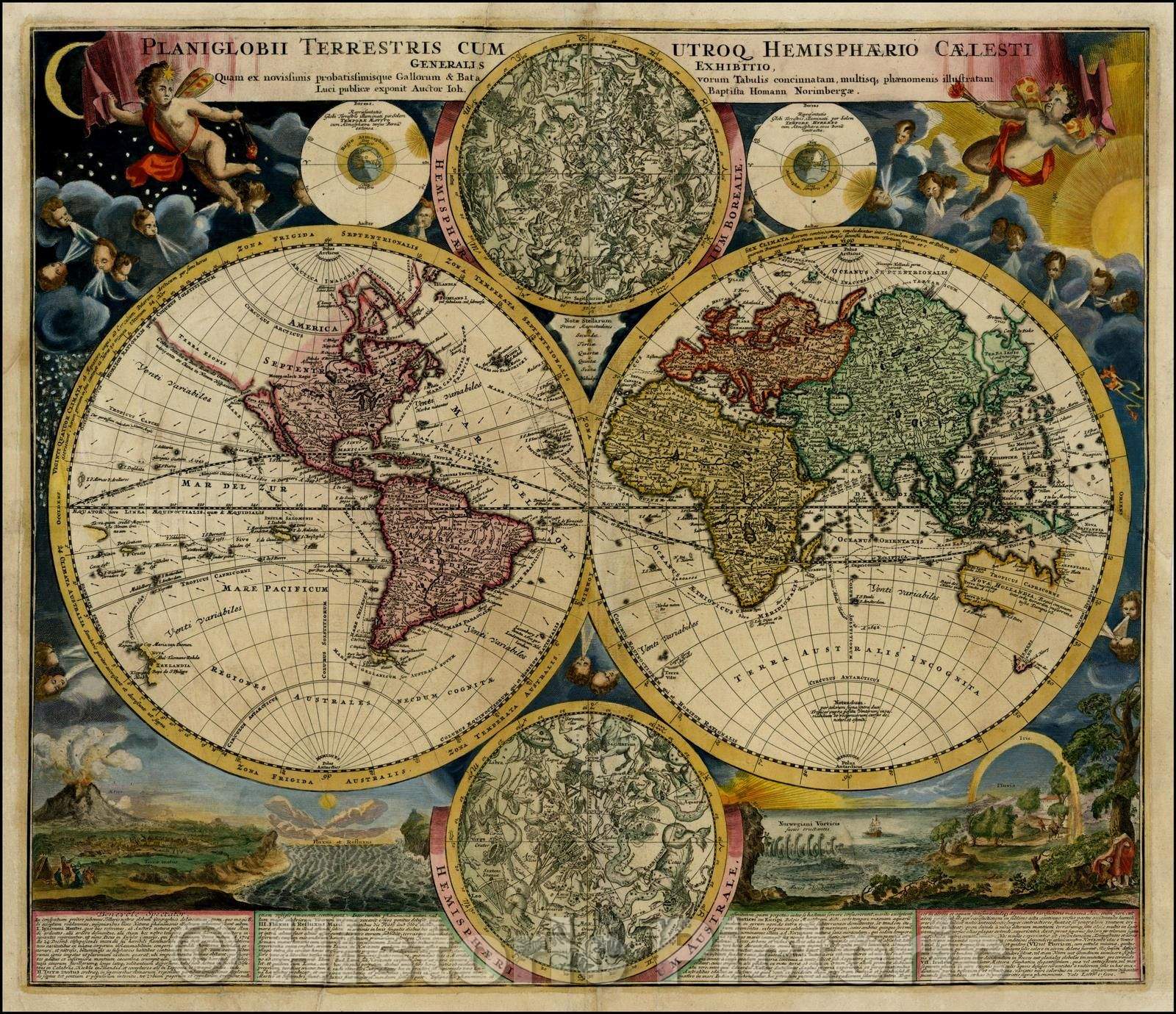 • .Historic Map - Planiglobii Terrestris Cum Utroq Caelesti Generalis Exhibitio/Double hemisphere Map of the world, Celestial models of the hemispheres, 1720 - Vintage Wall Art