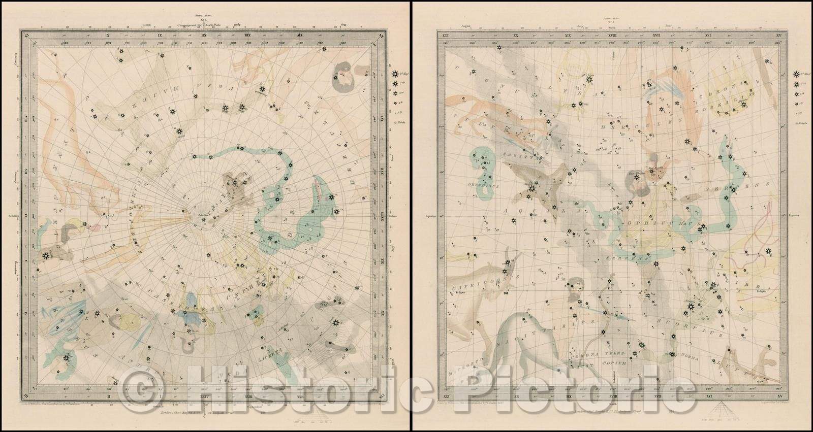Historic Map - Ursa Major, Cassiopea, Persius, Saggitarius, Capricorn, Ophiccus, Scorpius :: Celestial Charts, hand colored constellations, 1830 - Vintage Wall Art