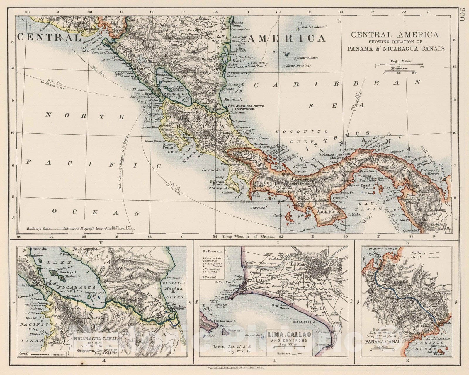 • .Historic Map : 1906 Central America Showing Relation of Panama & Nicaragua Canals. Lima, Callao. - Vintage Wall Art