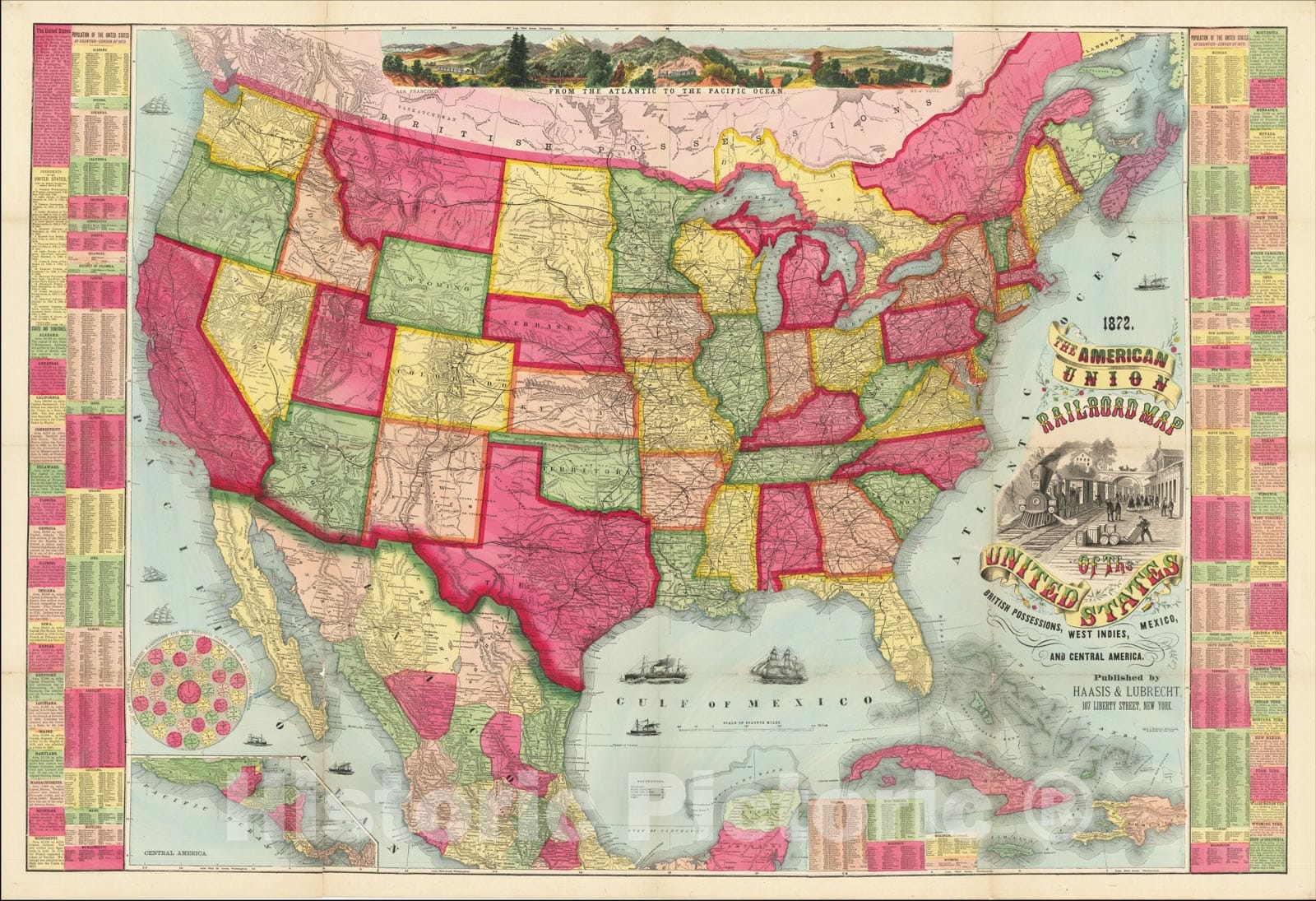 Historic Map : The American Union Railroad Map of the United States, British Possessions, West Indies, Mexico and Central America., Stuttgart , Vintage Wall Art