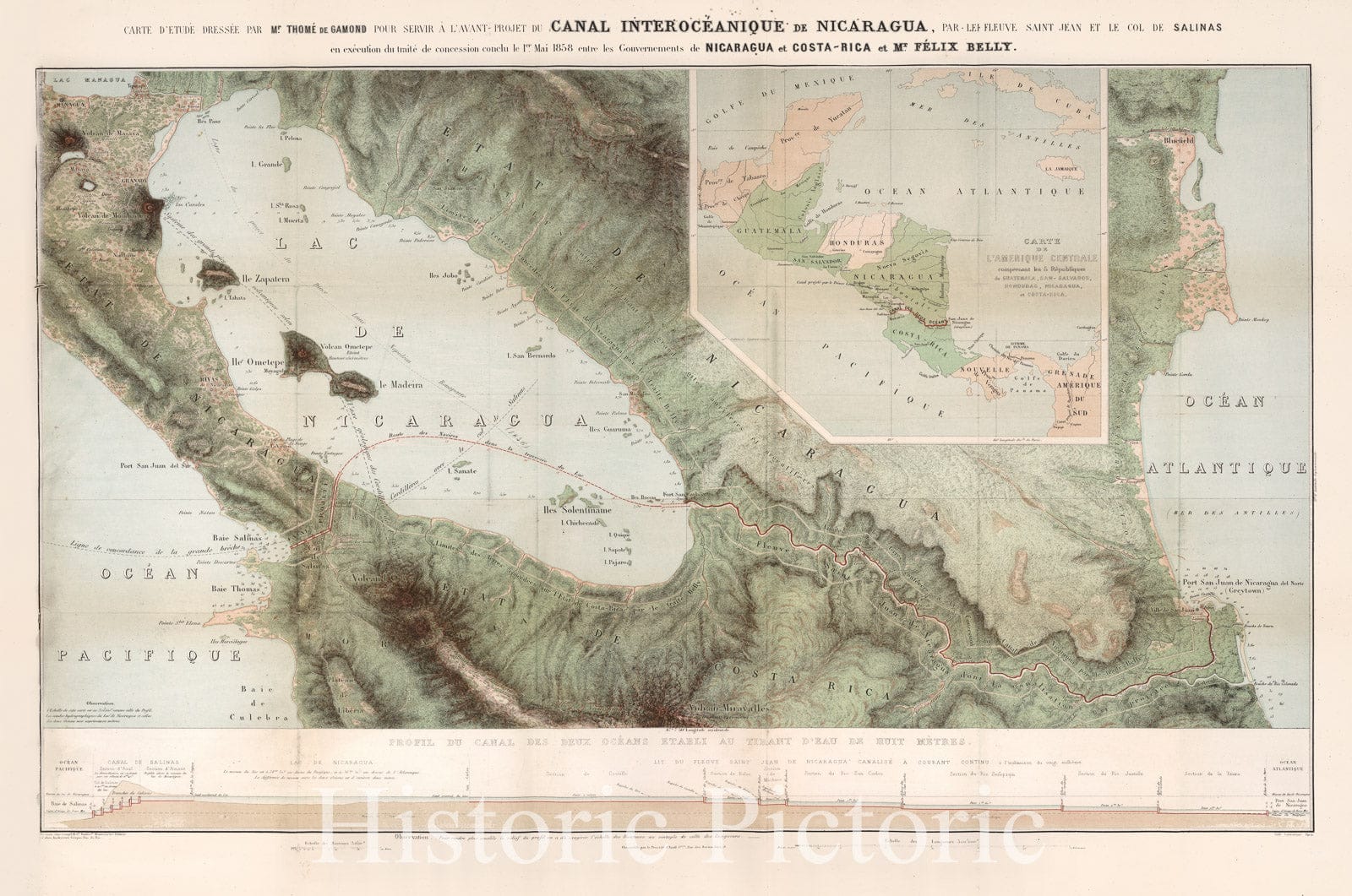 Historic Map : Nicaragua, , Central America 1858 Carte D'Etude Pour Le Trace Et Le Profil De Canal De Nicaragua , Vintage Wall Art