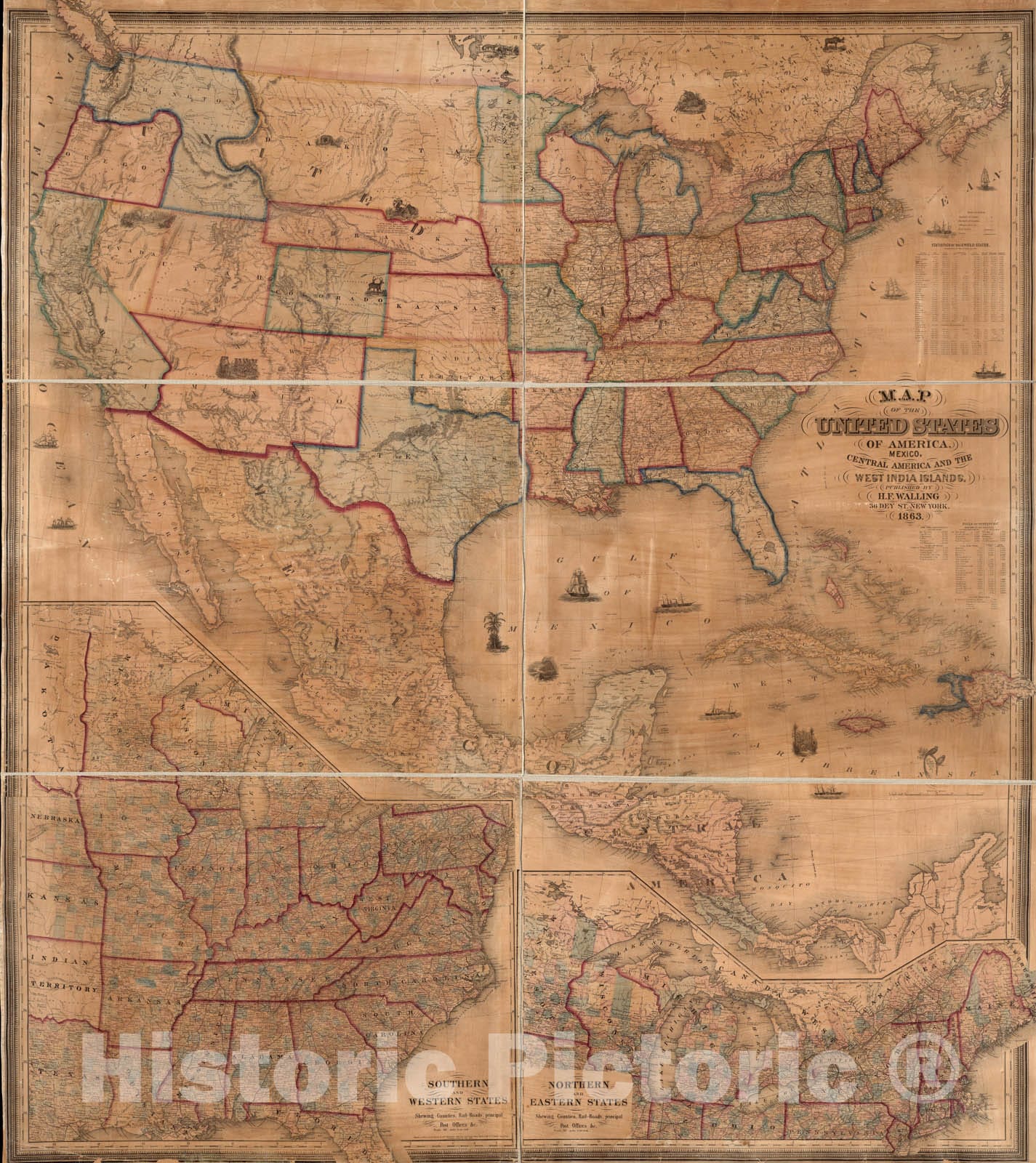 • Historical Map, 1863 Map of The United States of America, Mexico, Central America, and The West India Islands, Vintage Wall Art