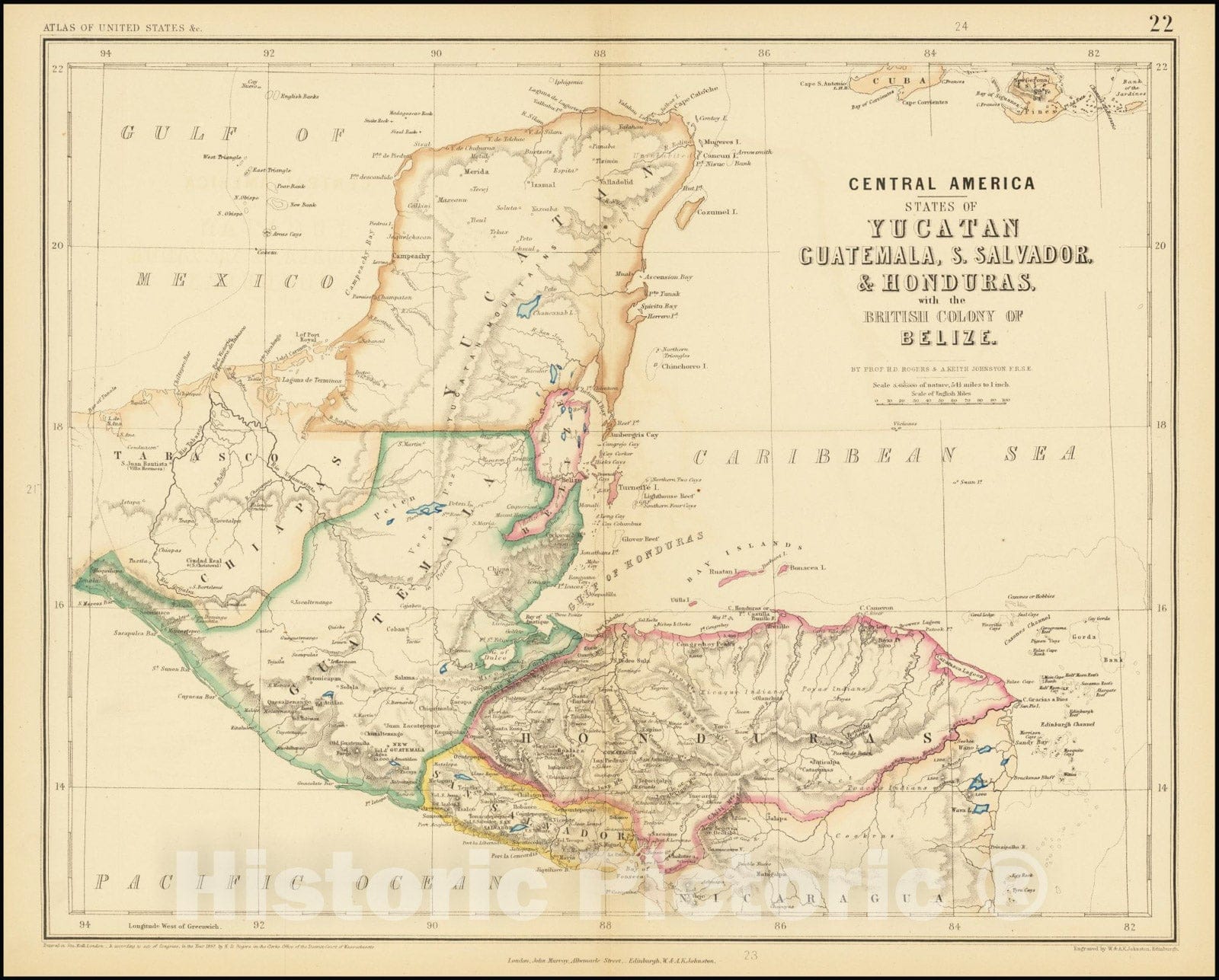 • .Historic Map : Central America -- States of Yucatan Guatemala, S. Salvador & Honduras, with the British Colony of Belize., 1857, Vintage Wall Art