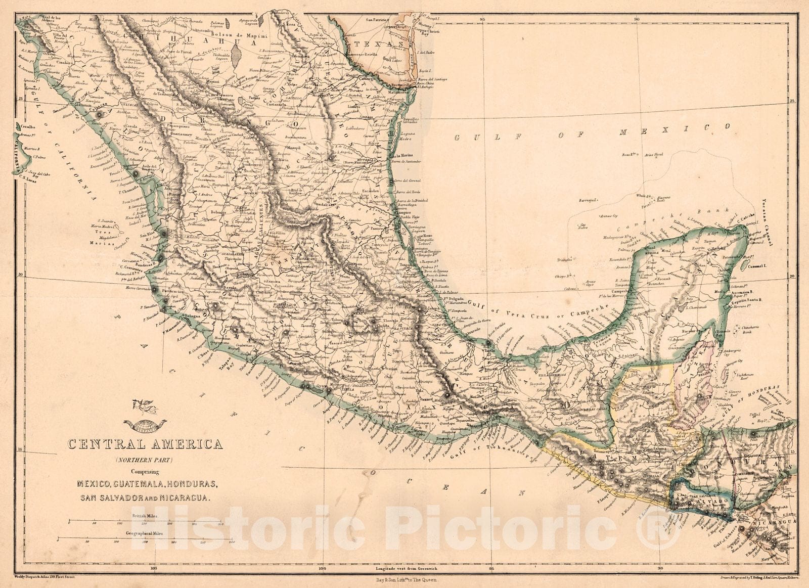 • .Historic Map : 1859 Central America (Northern Part) Comprising Mexico, Guatemala, Honduras, San Salrador, and Nicaragua : Vintage Wall Art