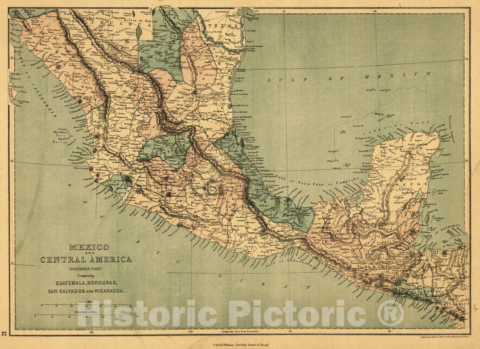 • .Historic Map : 1873 Mexico and Central America (Northern Part)  : Vintage Wall Art