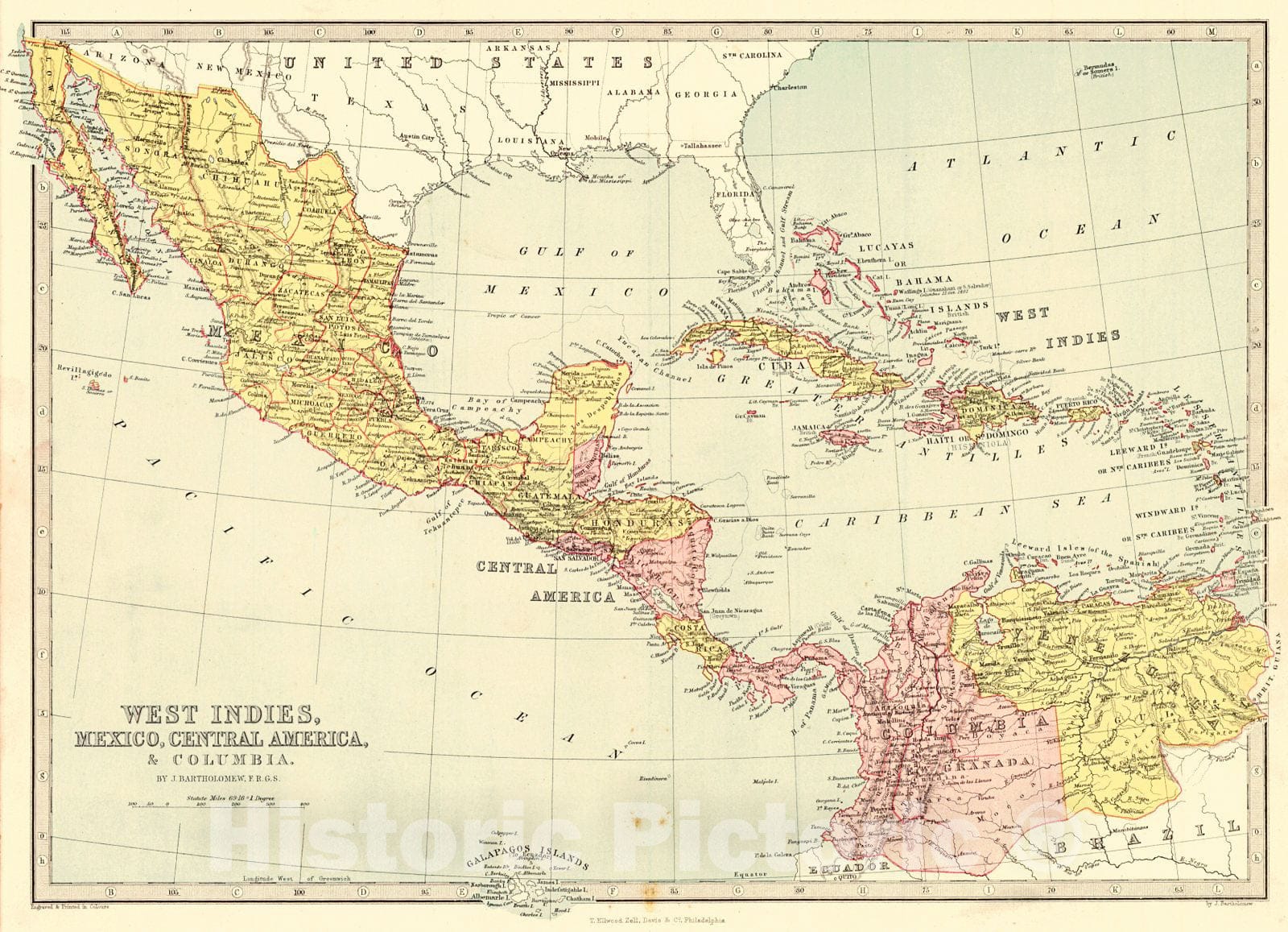 Vintage Map | 1881 West Indies, Mexico, Central America & Columbia | Bartholomew, John