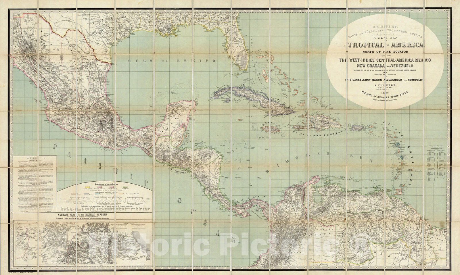 • .Historic Map : Colombia; Venezuela, Latin America, Central America; West Indies Case Map, H. Kiepert's Karte des nordlichen Tropischen America. 1858 , Vintage Wall Art
