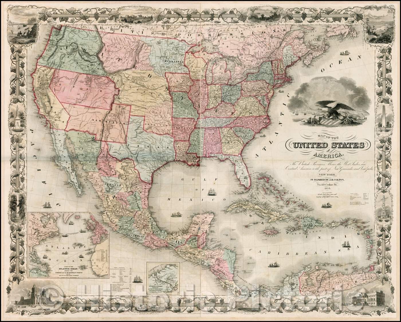 Historic Map - Colton's Map of the United States of America, The British Provinces, Mexico, The West Indies and Central America, 1854, Joseph Hutchins Colton - Vintage Wall Art