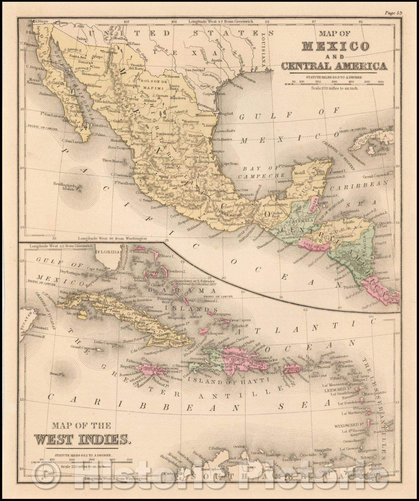Historic Map - Map of Mexico and Central America (with) Map of the West Indies, 1850, Samuel Augustus Mitchell - Vintage Wall Art