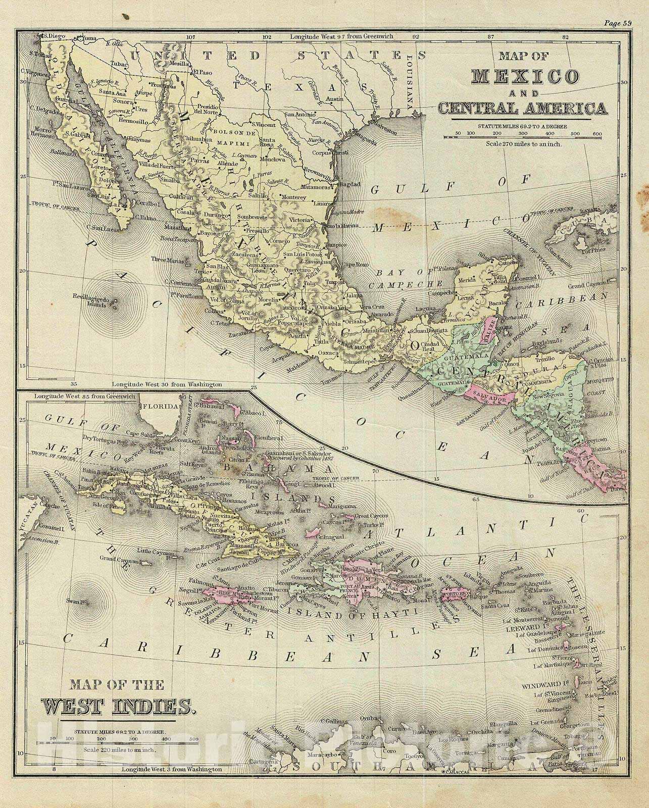This is an example of David M. Warren's 1879 map of Mexico, Central America and the West Indies. Divided into two parts, the upper map covers Mexico and Central America from Mexico to Costa Rica. The lower map details West Indies from the southern part of Florida to the northern part of South America and includes the Greater and Lesser Antilles as far east as Barbados. The map identifies the island of Guanahani or San Salvador in the Bahamas as the site where Columbus supposedly landed on October 12 of 1492. Throughout, the map identifies various cities, towns, rivers, islands, mountain passes and an assortment of additional topographical details. The map is color coded according to regional and political boundaries with elevation rendered by hachure. Issued as page 59 in the 1879 edition of Warren's Common-School Geography.