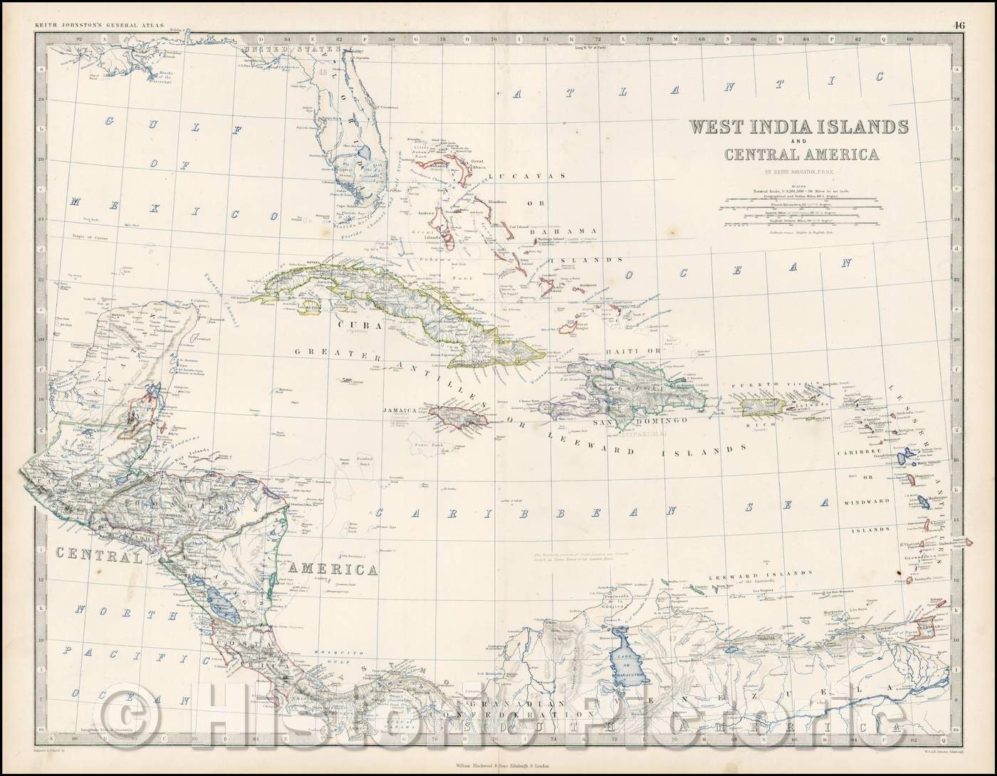 • .Historic Map - West India Islands and Central America, 1860, W. & A.K. Johnston v1