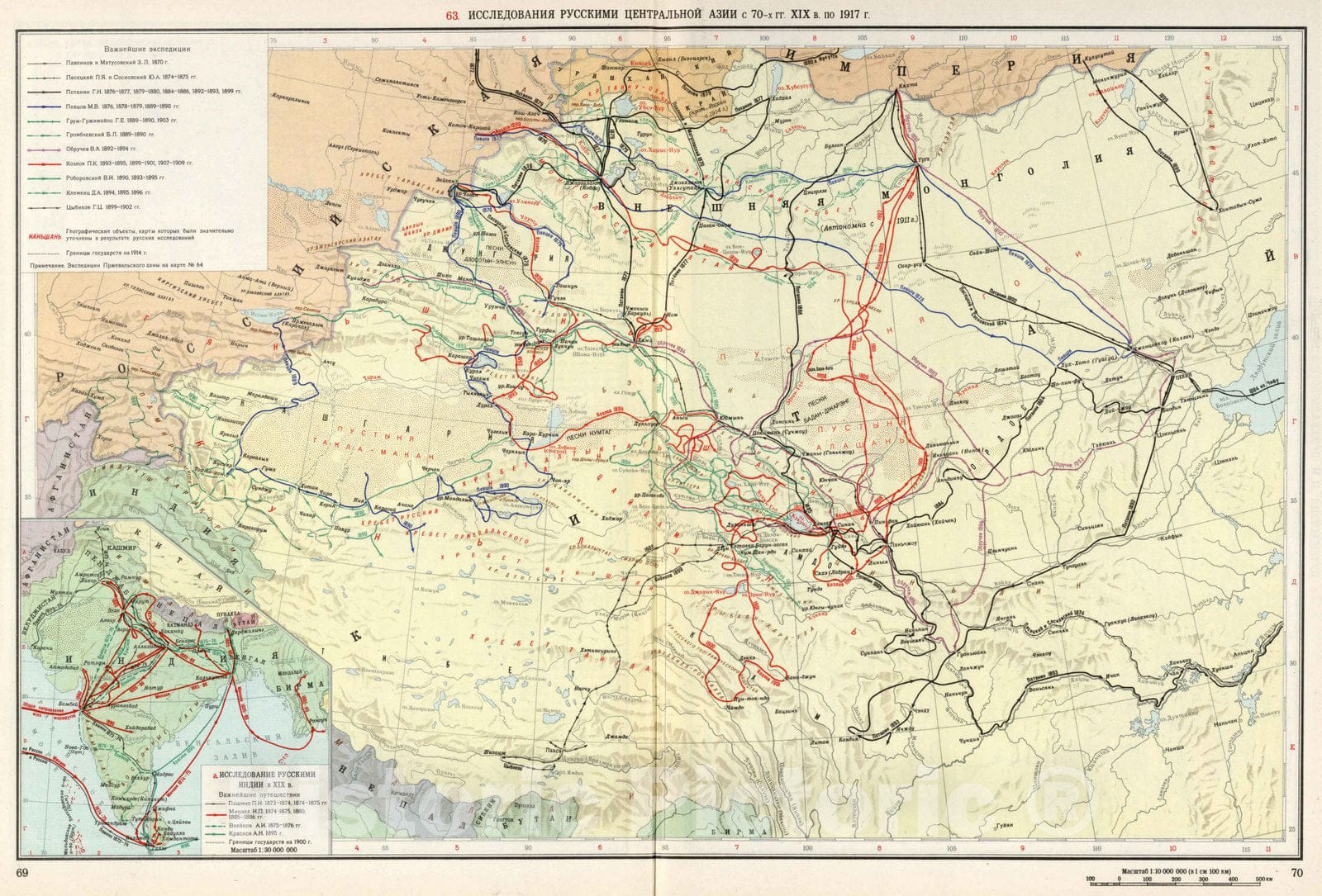 Historic Map : China, Central Asia Historical Atlas Map, 63. Issledovaniya Russkimi Tsentral'noy Azii s 70-x gg. XIX v. po 1917 g. 1959 , Vintage Wall Art