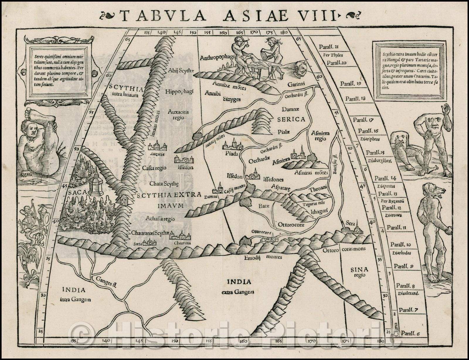 Historic Map - Tabula Asiae VIII [India & Central Asia with Monsters and Anthropomorphs], 1542, Sebastian M?nster - Vintage Wall Art