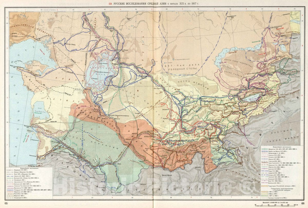 Historic Wall Map : Central Asia 59. Russkie Issledovaniya Srednei Azii s nachala XIX v. po 1917 g, 1959 Atlas , Vintage Wall Art