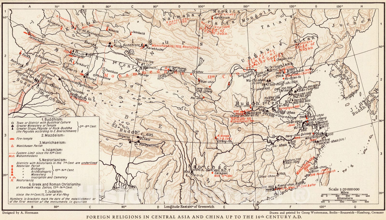 Historical Map, 1935 Foreign Religions in Central Asia and China up to The 14th Century A.D, Vintage Wall Art