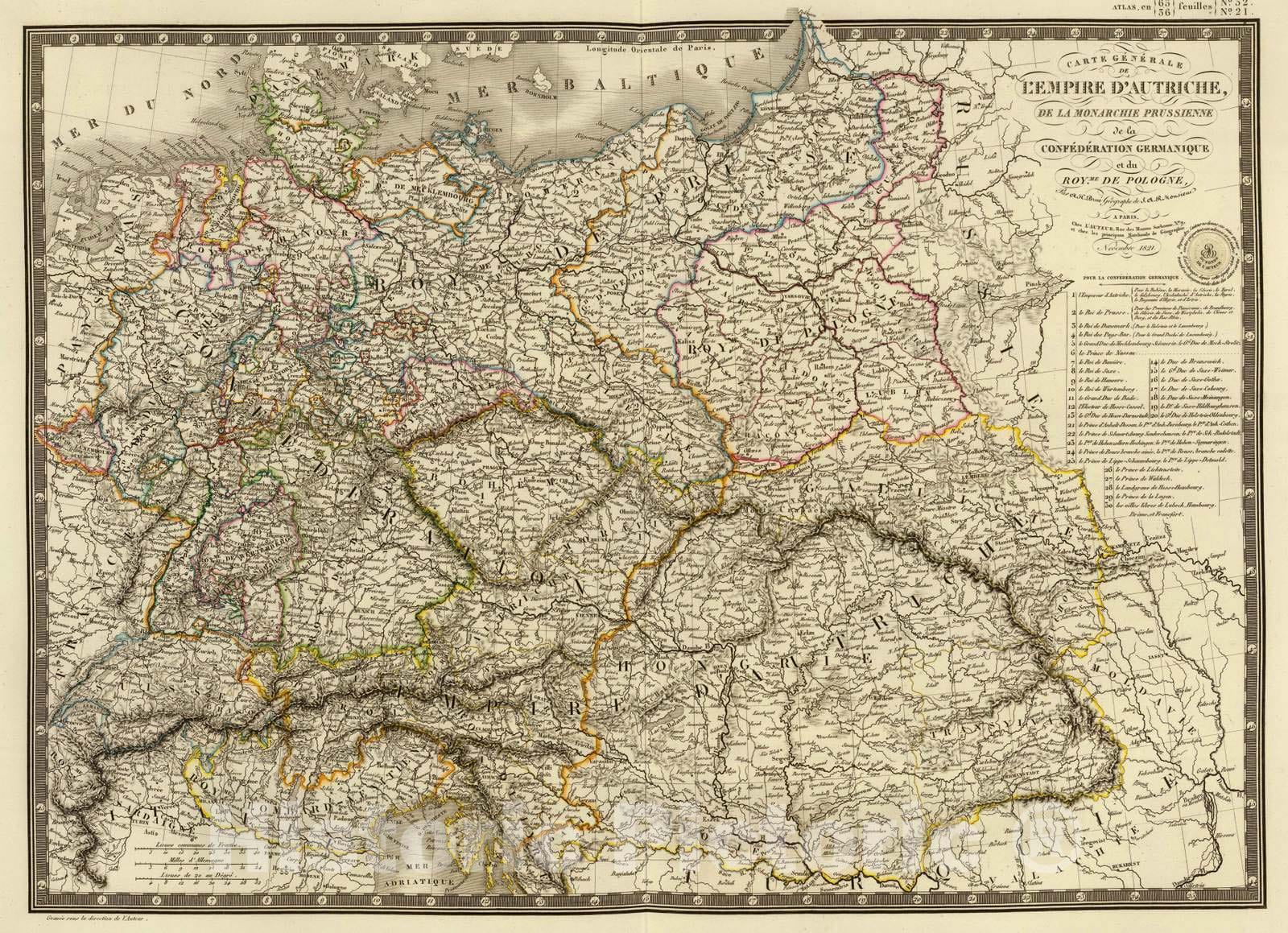 Historic Map : Austria; Germany, Europe, Central 1821 Empire d'Autriche, Monarchie Prussienne, Confederation Germanique, Pologne. , Vintage Wall Art