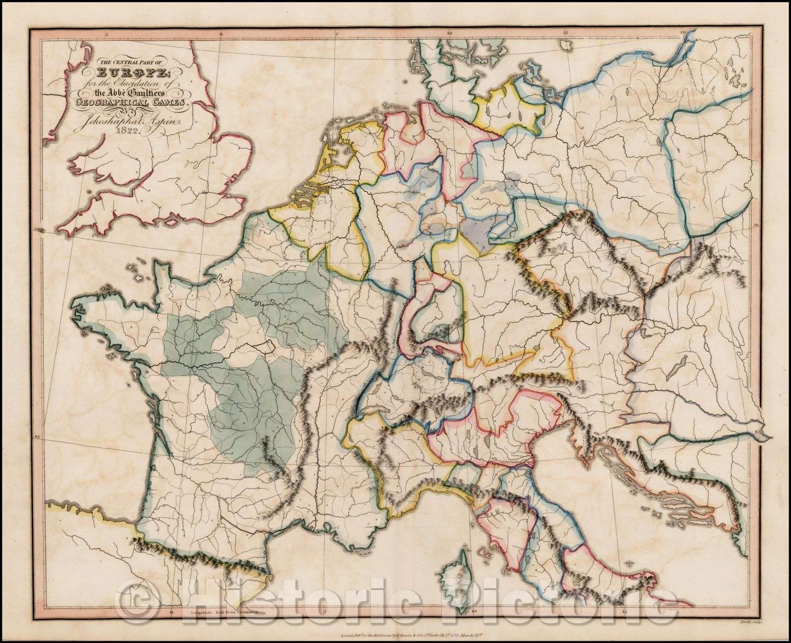 Historic Map - The Central Part of Europe, for the Elucidation of the Abee Gaultiers Geographical Games, 1823, Jehoshaphat Aspin - Vintage Wall Art
