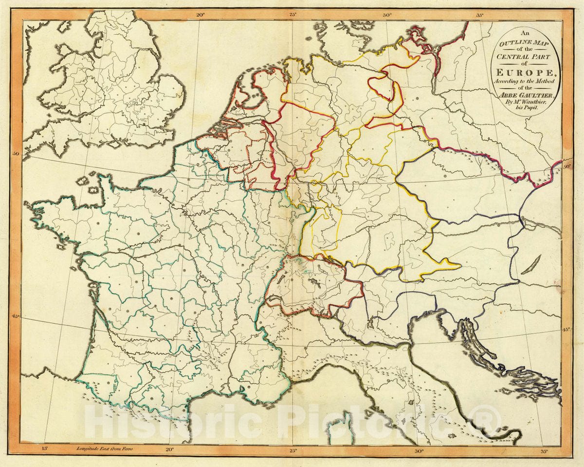Historic Map : an Outline map of The Central Part of Europe, According to The Method of The Abbe Gaultier, by Mr. Wauthier, his Pupil. (1821), 1821 Atlas - Vintage Wall Art