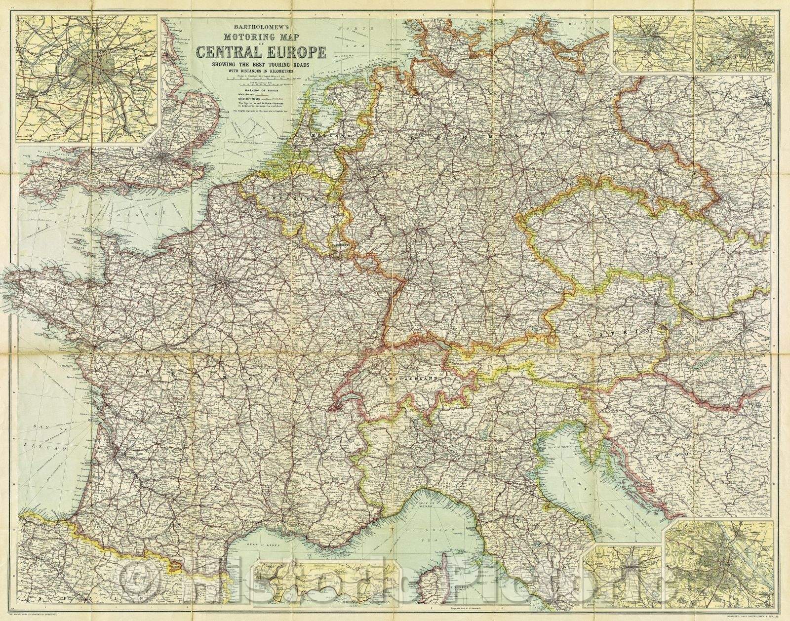 Historic Map : Bartholomew's Motoring Map of Central Europe : showing the best touring roads with distances in kilometres, 1937 , Vintage Wall Art