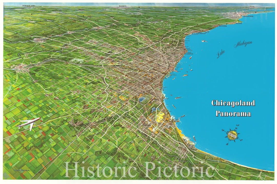 Map : Chicago, Illinois 1958?, Chicagoland panorama map in full color : pictures and directory, highways, points of principal interest , Antique Vintage Reproduction