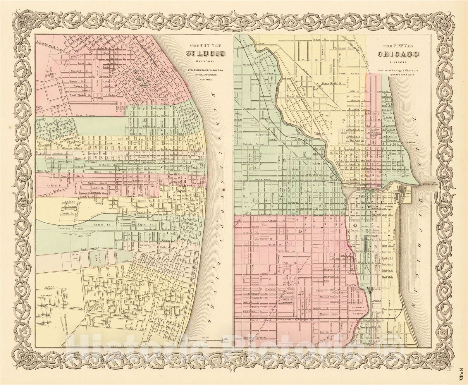 Historic Map : The City of St. Louis with The City of Chicago, 1859, Joseph Hutchins Colton, Vintage Wall Art