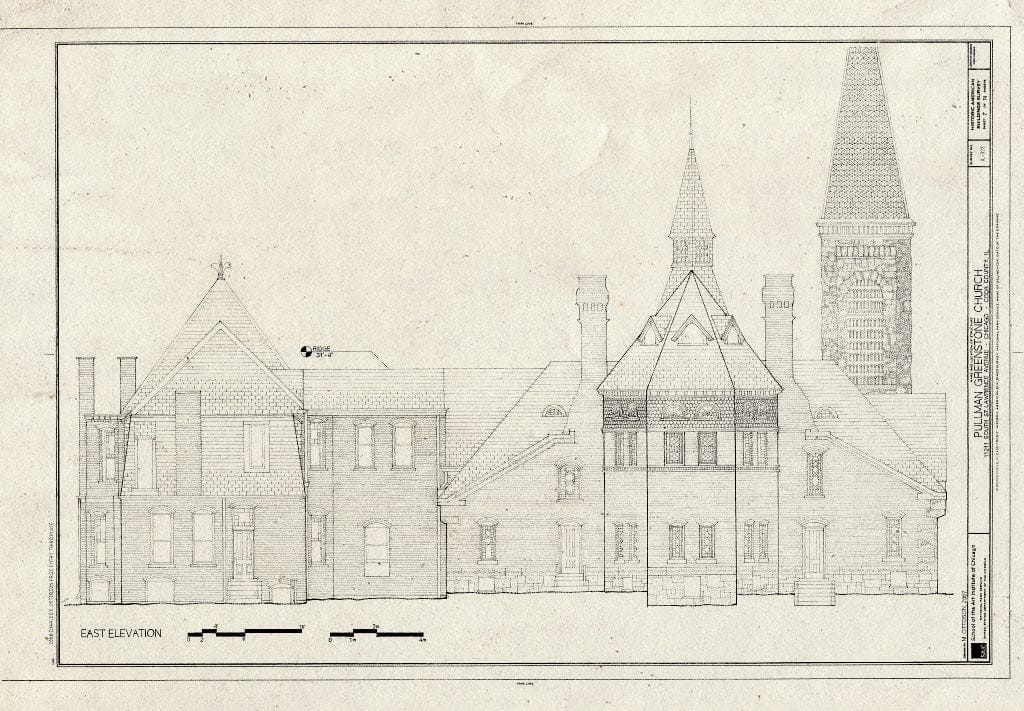 • Blueprint East Elevation - Pullman Greenstone Church, 11211 South St. Lawrence Avenue, Chicago, Cook County, IL