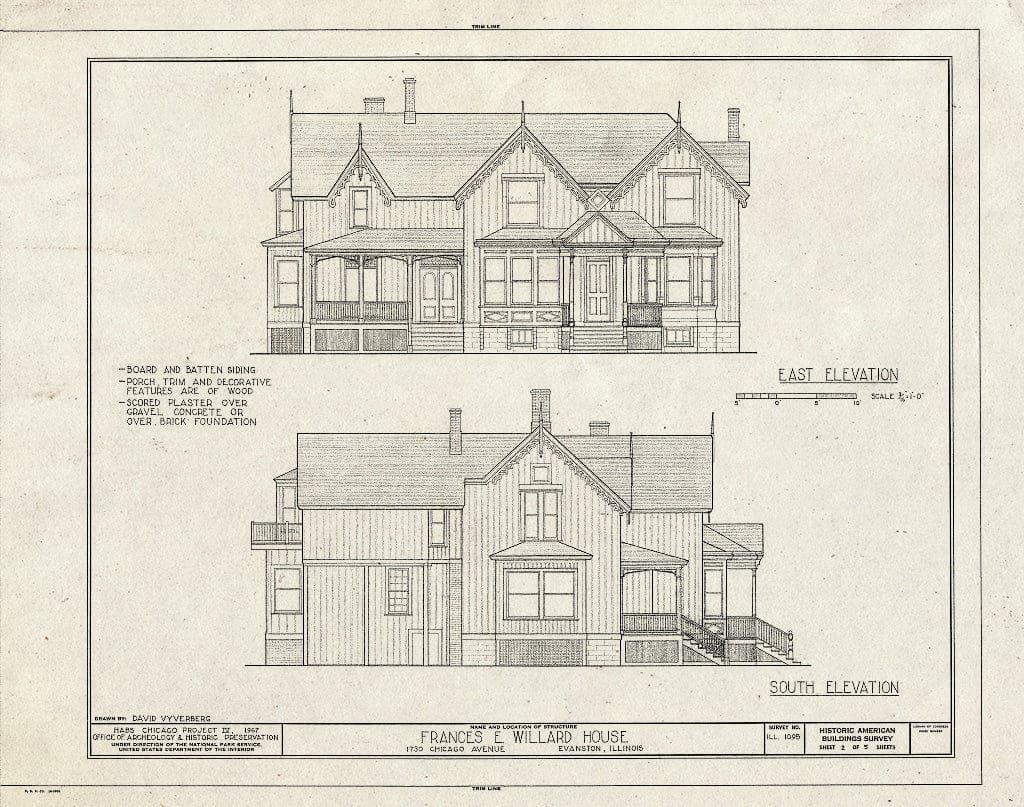Blueprint East and South elevations - Frances E. Willard House, 1730 Chicago Avenue, Evanston, Cook County, IL