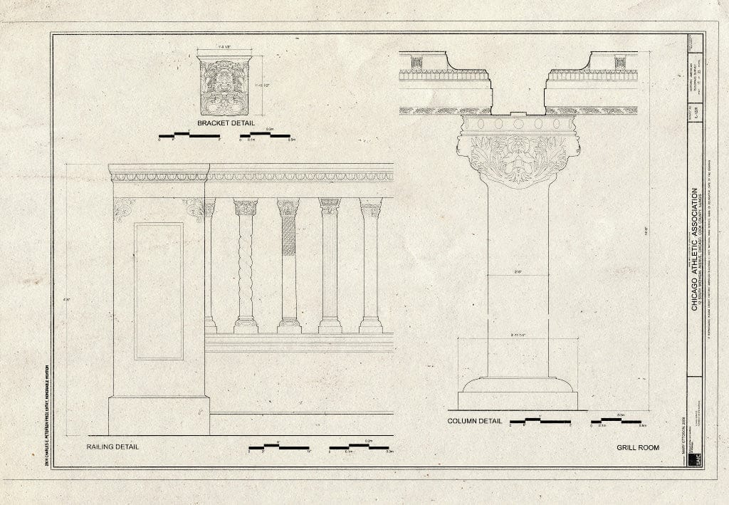 Blueprint Grill Room, Including Railing Detail and Column Detail - Chicago Athletic Association, 12 South Michigan Avenue, Chicago, Cook County, IL