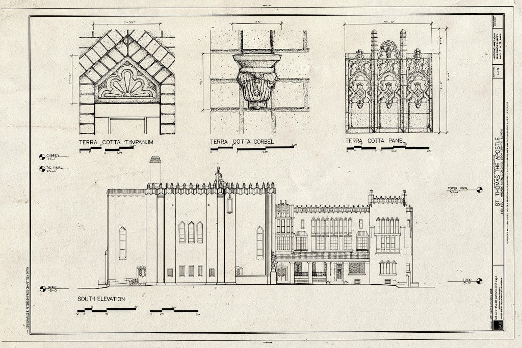 South Elevation and Details of Terra Cotta Tympanum, Corbel, and Panel - St. Thomas the Apostle Church, 5472 South Kimbark Avenue, Chicago, Cook County, IL